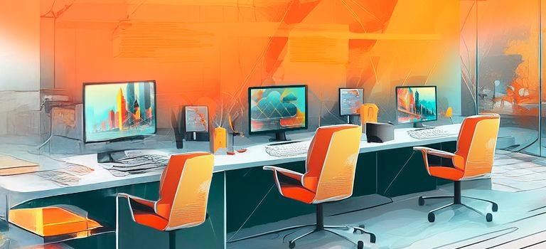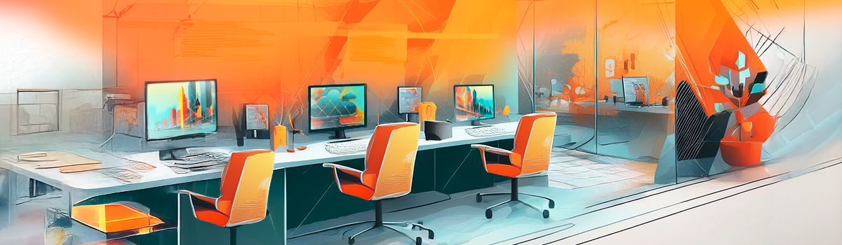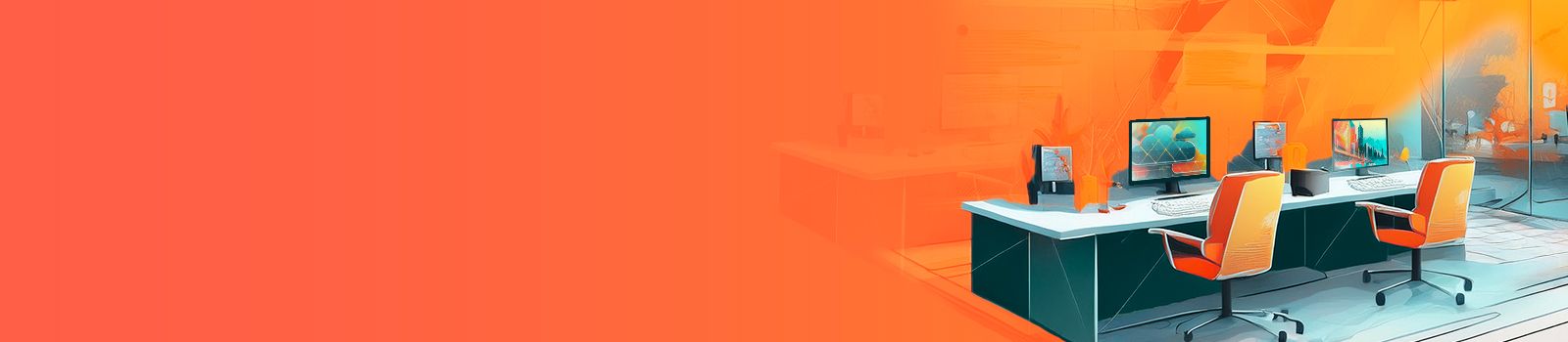 Orange gradient fading into a sketched office setting showing two orange chairs at two desks with monitors.