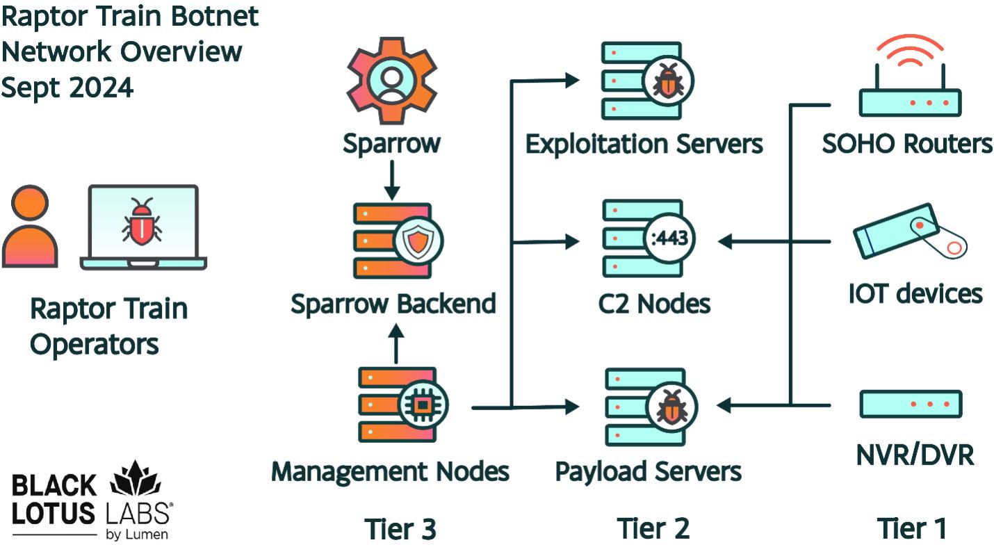 In mid-2023, Black Lotus Labs began an investigation into compromised routers that led to the discovery of a large, multi-tiered botnet consisting of small office/home office (SOHO) and IoT devices that we assess is likely operated by the nation-state Chinese threat actors known as Flax Typhoon. We call this botnet “Raptor Train,” and it has been over four years in the making.