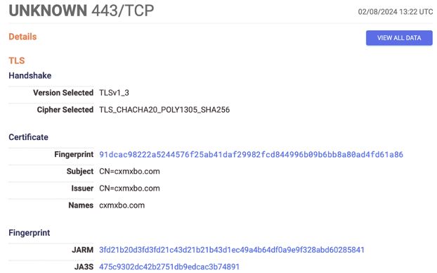 The C2 servers in Tier 2 receive the callbacks from compromised devices in Tier 1 over port 443. A signature feature of the Tier 2 C2 servers is the exposed C2 port, 443, with a TLS certificate displaying a random alphanumeric domain in the subject and issuer fields, as seen below: