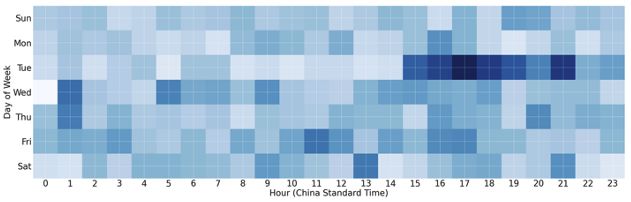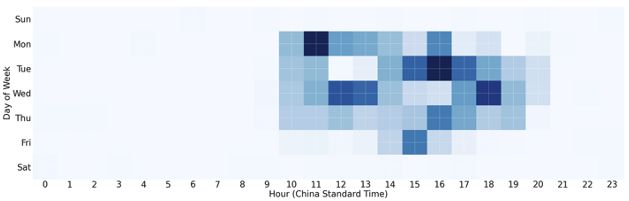Analysis of Tier 3 management node sessions in which the nodes are connecting to Tier 2 C2 servers for management activity shows almost exclusively Chinese working hours, Monday through Friday: