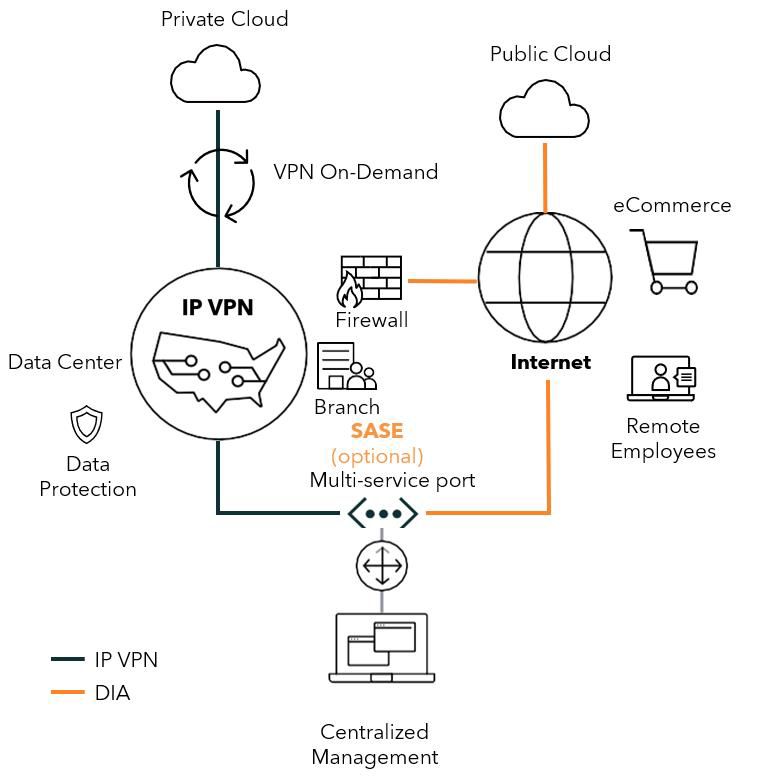 - Optimized performance: Our Aggregate Multi-service Port technology allows both DIA and VPN to be provisioned for full port speed, with intelligent traffic prioritization to maximize bandwidth efficiency.