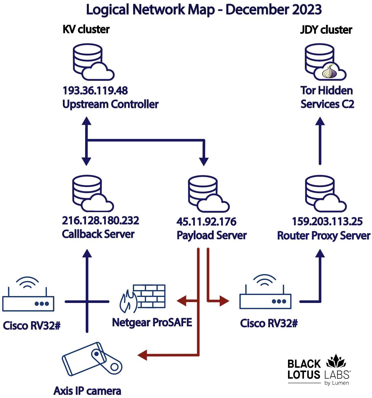 - Several router proxy servers, referred to as the “JDY” nodes based upon their X.509 certificates, that communicated exclusively with the infected Cisco RV32# devices. These nodes were previously labeled “BBC” based on artifacts in the certificates prior to restructuring the network.