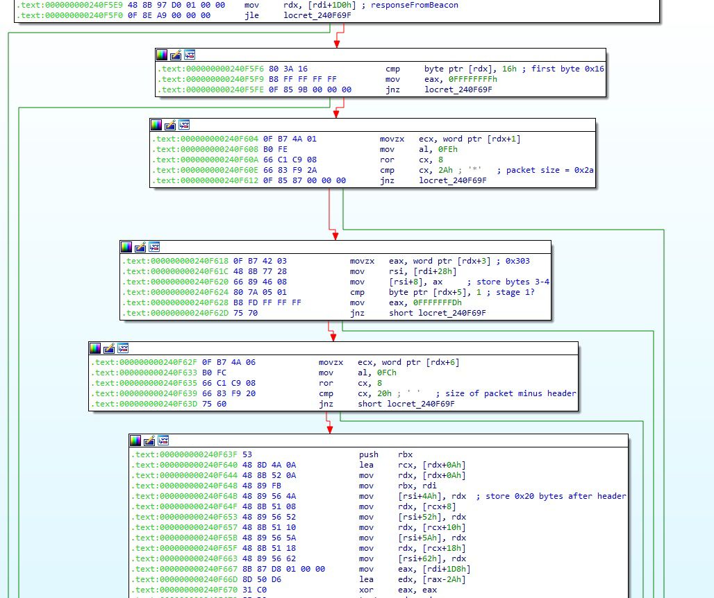 Following the initial interaction it will check for additional packets, and, if the local and packet state are both 2, it will check that the data after the header contains an RSA public key and attempt to confirm/validate it. If it passes the validation, it will set the local state to 5 and beacon out to the C2 with what appears to be a larger encrypted beacon.