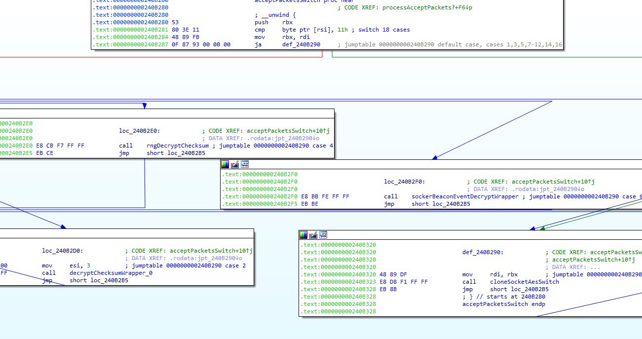 The generated open port appears to expect a similar packet with 0x16 as the first byte, checks the packet size and verifies the checksum as previously mentioned. It appears to decrypt the packet which contains additional commands, including cloning and open additional sockets.