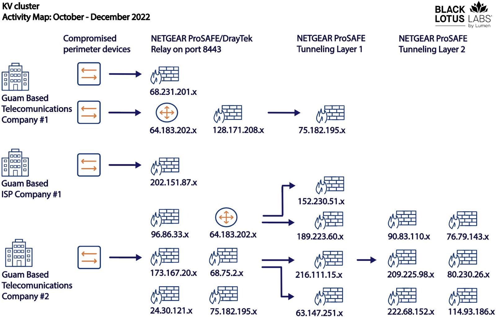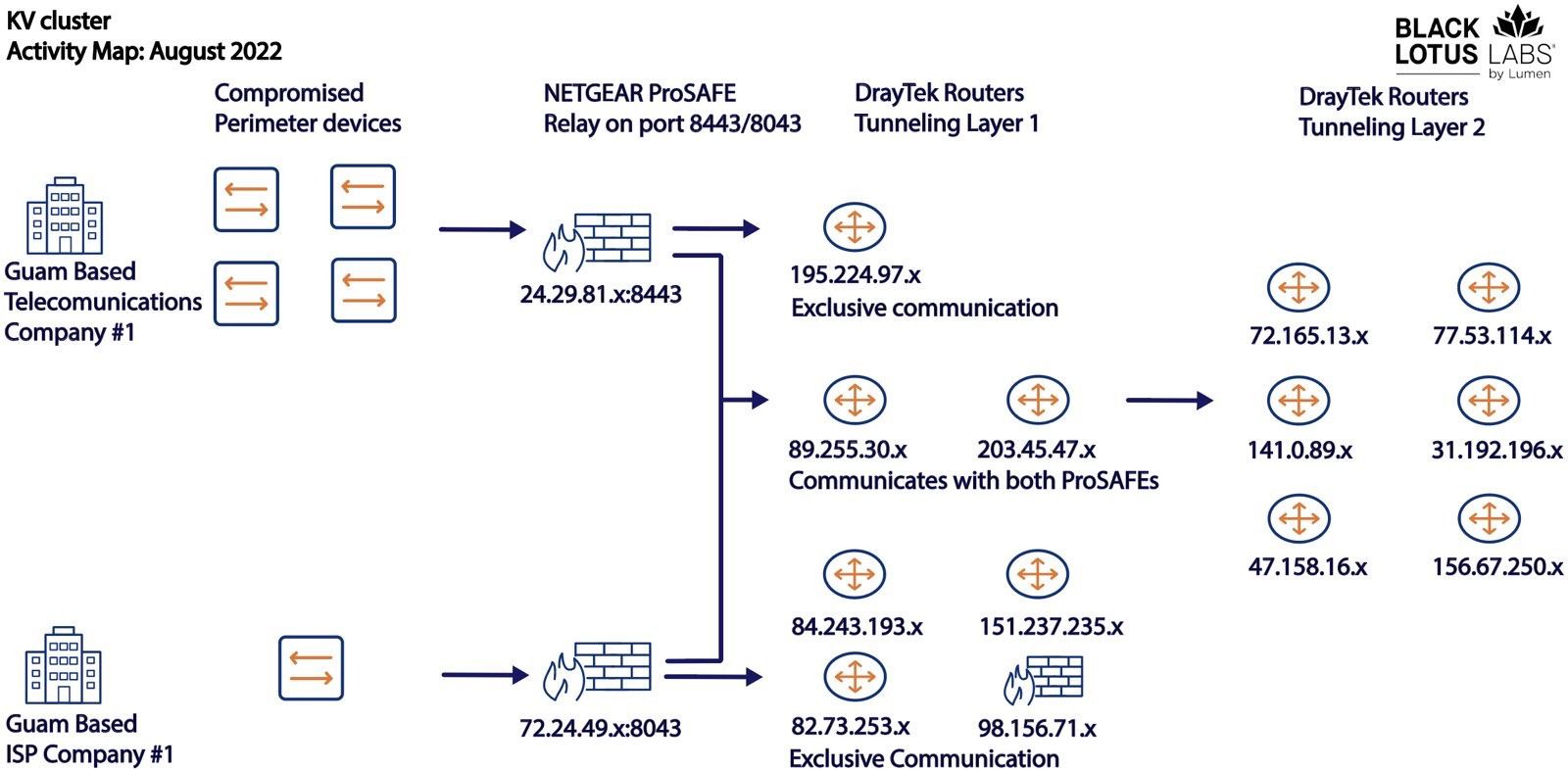 Our investigation into the KV-botnet began as we tracked a separate activity infecting similar device models to those in this report. As this cluster took shape, Lumen telemetry indicated there was a correlated payload server that did not align with the objectives of our previous case but was active enough to warrant inspection. As we began to monitor the devices interacting with this payload server, we broke them into clusters based upon device make and model. We observed one NETGEAR ProSAFE device maintain a multi-day long connection, performing a large data transfer with an IP address associated with a Guam-based ISP over port 8443. The same IP address was also communicating on an outbound port 8443 to a DrayTek router. This led us to believe the ProSAFE device was acting as a proxy, or relay node, as part of a covert network. The use of ProSAFE firewalls as an operational relay node was first observed in Lumen data between July 12-22, 2022.