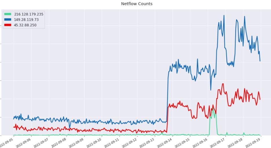 The Cisco devices then communicated with one of the Cisco proxy servers for C2, referred to as the “BBC” cluster based upon artifacts associated with the X.509 certificates. Two of the initial proxy servers that we identified were: 45.32.88[.]250 and 149.28.119[.]73. In addition, we observed a strong time-series correlation in activity patterns between the payload servers and the router proxy servers during a snapshot in September 2022. As the new campaign unfolded that month with another round of exploitation, the data represented in the graph below showed a significant uptick in traffic from the bots to the router C2s, at 216.128.179[.]235.