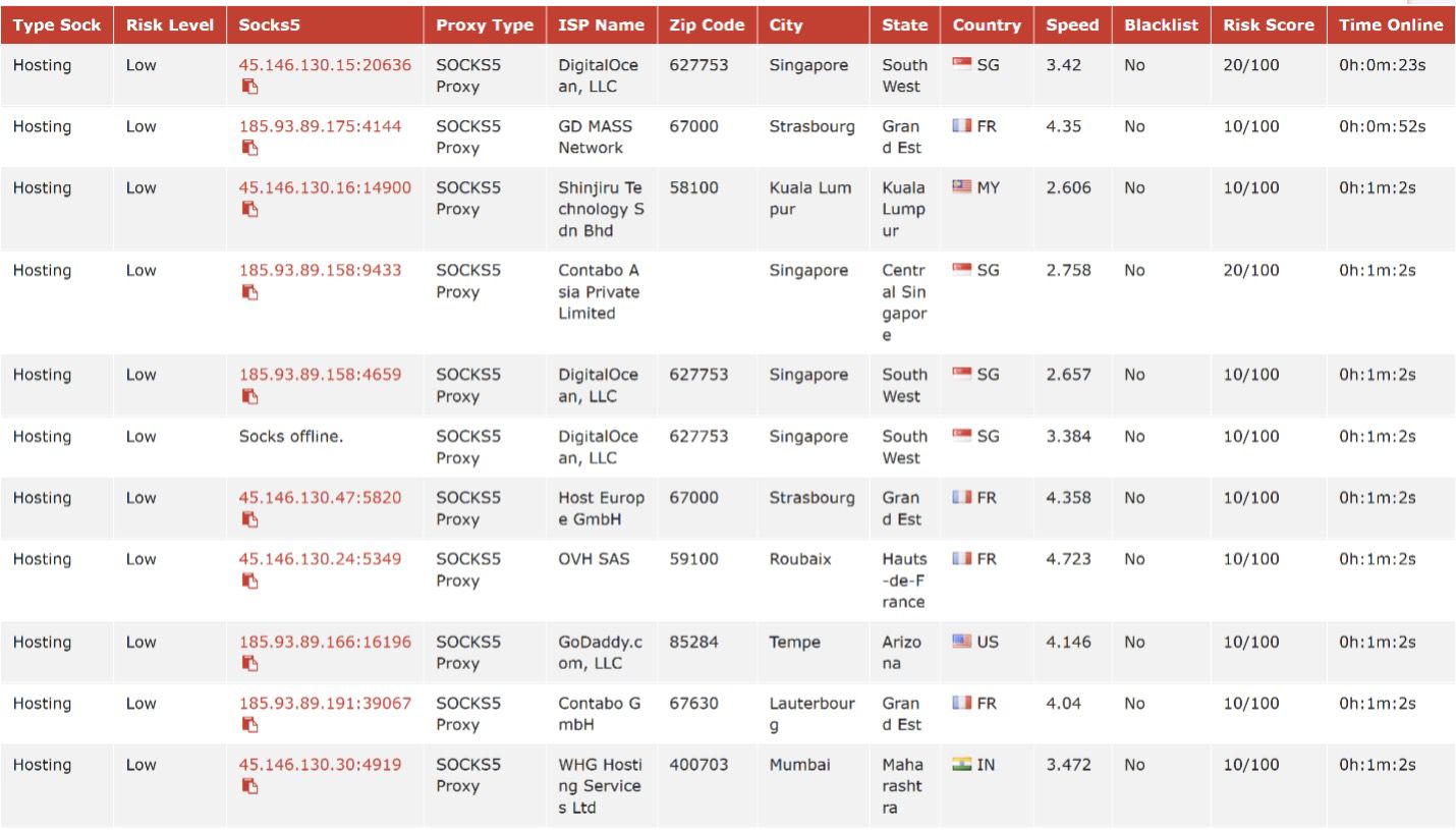 We also observed the Vietnamese-based VN5Socks (a.k.a. Shopsocks5) proxy service offering these IPs in their service, similar to their use of Ngioweb bots acquired through NSOCKS. It appears that after the Ngioweb takedown, VN5Socks diversified their sources and started buying from the actor behind this SystemBC botnet.