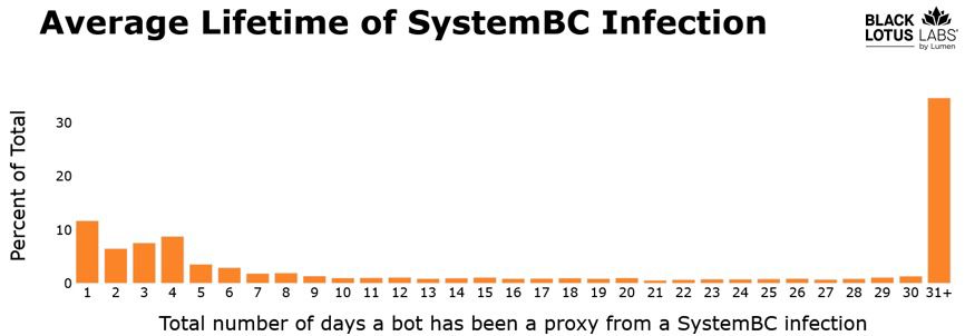 The Black Lotus Labs team at Lumen Technologies has uncovered new infrastructure behind the “SystemBC” botnet, a network composed of over 80 C2s with a daily average of 1,500 victims, nearly 80% of which are compromised VPS systems from several large commercial providers. The victims are made into proxies that enable high volumes of malicious traffic for use by a host of criminal threat groups. By manipulating VPS systems instead of devices in residential IP space as is typical in malware-based proxy networks, SystemBC can offer proxies with massive amounts of volume for longer periods of time. Similar, high-bandwidth proxies in residential IP space would alert and disrupt users of smaller, lower bandwidth devices.