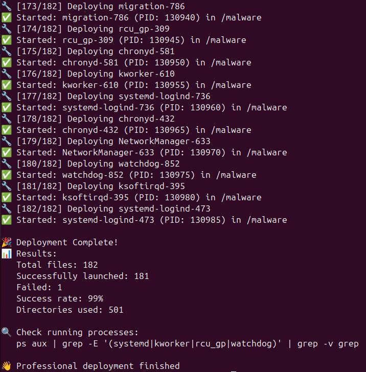 Analysis of our global IP telemetry revealed that 104.250.164[.]214 appears to be the source of attacks to recruit potential victims, as well as the sole host of the SystemBC malware samples. Initial access attempts are sent on port 443, and, if successful, the new bot will call back on port 80 to download a shell script (with Russian comments) that forces the download over 180 samples of the SystemBC malware. The script will also direct the victim to run every sample simultaneously, with each sample under a separate file name. An image showing the process is below: